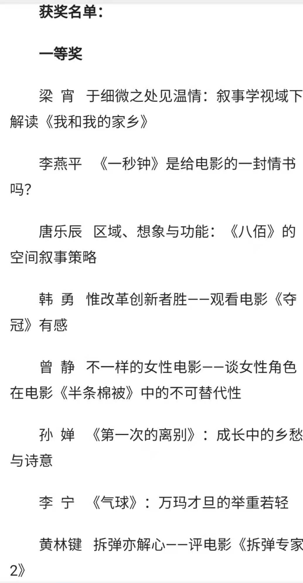 据悉,本次征文旨在展示“湘观影”全省职工观影活动和“光影铸魂”电影党课活动成果,培育电影文化,推动电影产业健康繁荣发展,共收到影评文章451篇,经过初评、复评,最终评选出一等奖8篇,二等奖21篇,三等奖31篇。