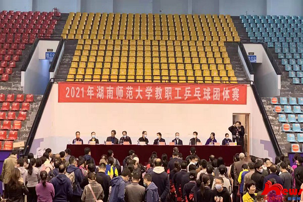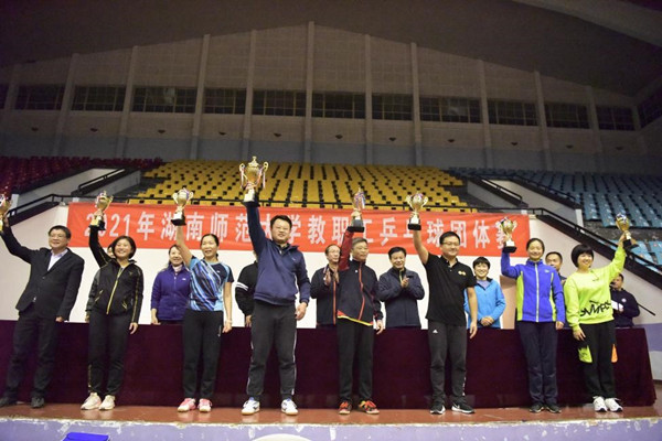 一直以来,我校高度重视教职工文体活动,教职工乒乓球团体赛是我校一年一度的传统赛事,旨在全面贯彻落实全民健身国家战略,助力健康中国建设,不断提高教职工的身体素质和健康水平,促进教职工之间的交流。2020年因受疫情影响延期,此次比赛经过学校疫情防控办审批,并严格落实疫情防控措施。比赛吸引了来自各二级单位共32支代表队、448名运动员参与,院士教授带头参赛,湖南师范大学第一附属医院(省人民医院)、师大附中和湘东医院代表队应邀参赛。比赛为期两天,分预赛和决赛两个阶段进行。预赛采用分组循环赛制,决赛采用单淘汰赛制。比赛过程中,教职工们以高涨的热情全身心地投入到比赛当中,直拍、横拍、正手、反手、扣球、旋转球、弧线球,一次次挥拍对战展现了精湛的球技,现场不时传出热烈的喝彩声。经过激烈角逐,外国语学院代表队在决赛中再度蝉联冠军。