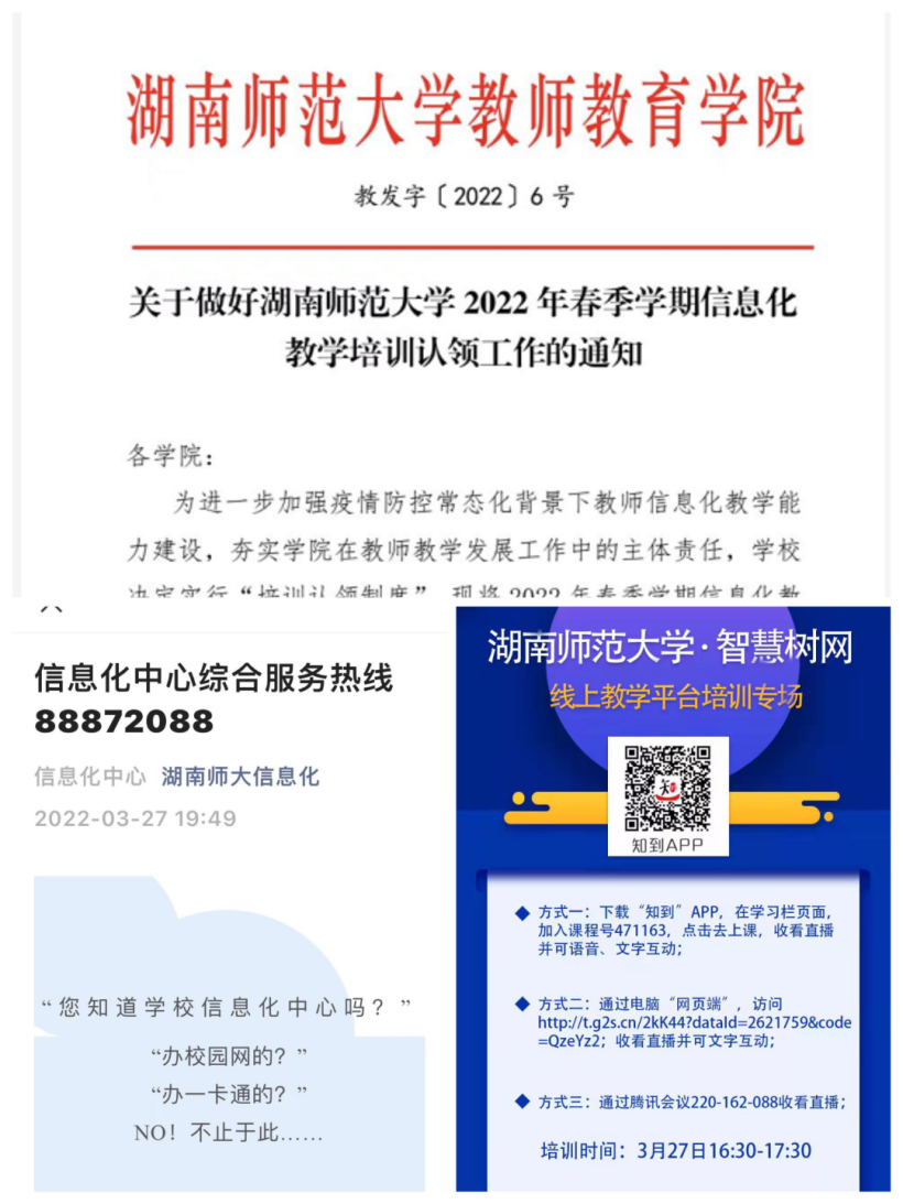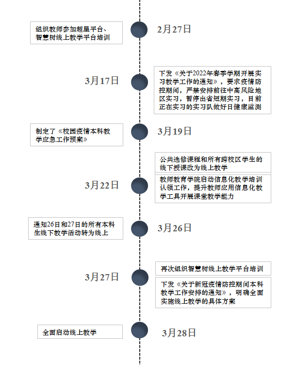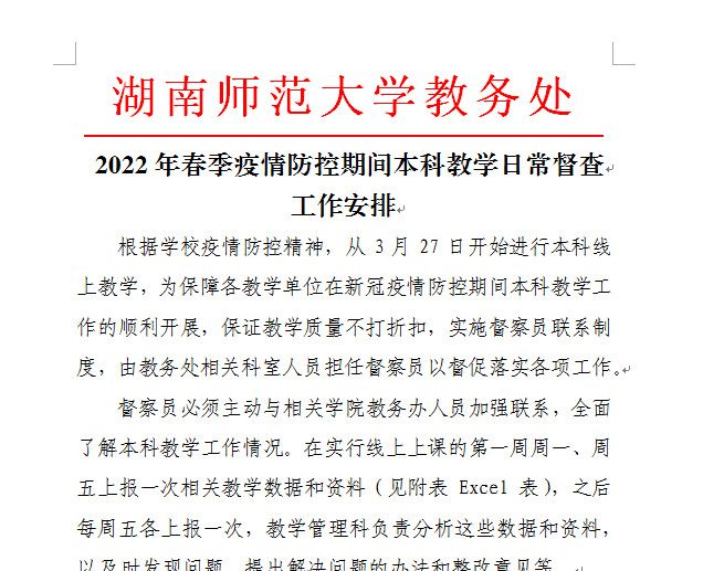 (供稿 教务处 评建办)受近期新一波疫情影响,我校被列为疫情管控区。据教育厅、岳麓区和学校疫情防控办的要求,本着“防控和教学”两不误的原则,教务处(双创办)、评建办及时响应,立即启动《湖南师范大学疫情本科教学工作应急预案》,“疫”键切换,于3月28日全面开启本科线上教学。