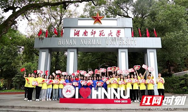 湖南师范大学建校85周年之际,师生在“老校门”前合影。