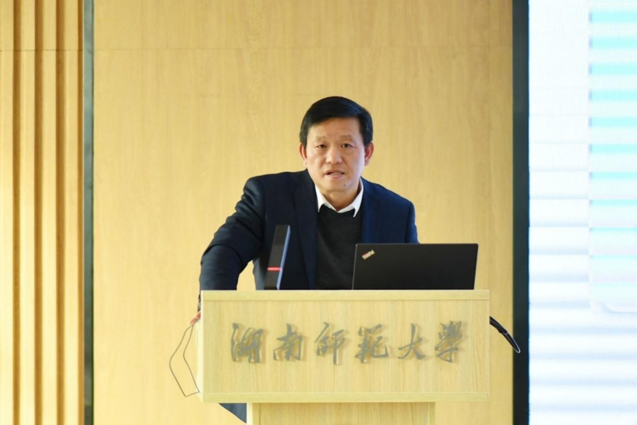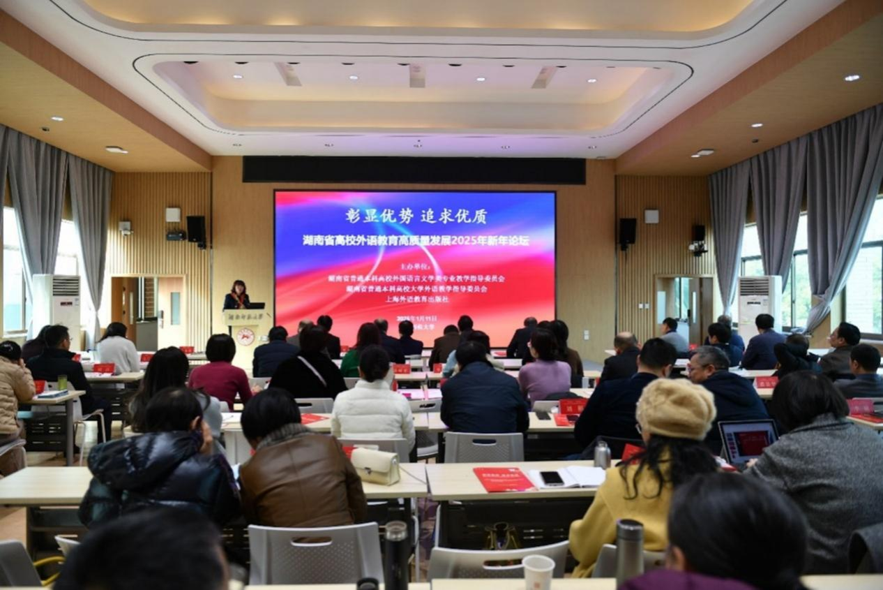 (供稿 外国语学院)1月11日,湖南省高校外语教育高质量发展2025年新年论坛在我校举行。国务院学位委员会第八届外国语言文学学科评议组召集人、全国翻译专业学位研究生教育指导委员会专家委员会副主任、中国译协副会长、上海外国语大学副校长查明建,我校党委书记、欧洲科学院院士、湖南省普通本科高校外国语言文学类专业教学指导委员会主任委员蒋洪新出席论坛并作主旨发言。外国语学院院长曾艳钰主持论坛。