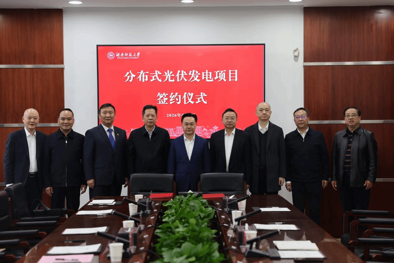 我校长期致力于推进绿色低碳发展,是全国公共机构“能效领跑者”单位。此次签约分布式光伏发电项目,是学校积极响应国家能源战略、推动校园能源结构优化升级的重要举措,也是校企双方深化务实合作、共同服务湖南“三高四新”美好蓝图的有力实践。