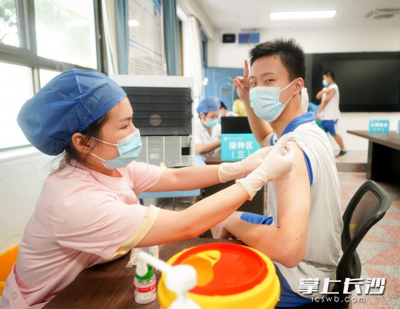 长沙晚报掌上长沙8月8日讯(全媒体记者 舒文 通讯员 苏晓玲)“感谢国家的政策,感谢学校的精心安排,让我们在下个学期的学习里更加安心了。”今日上午8时5分,湖南师大附中高三学生邹伊凡同学在校接种完新冠疫苗后,对记者说。今日,湖南师大附中根据自愿接种、应种尽种、就近方便原则,组织了家住长沙城区的高一至高三学生入校接种新冠疫苗。