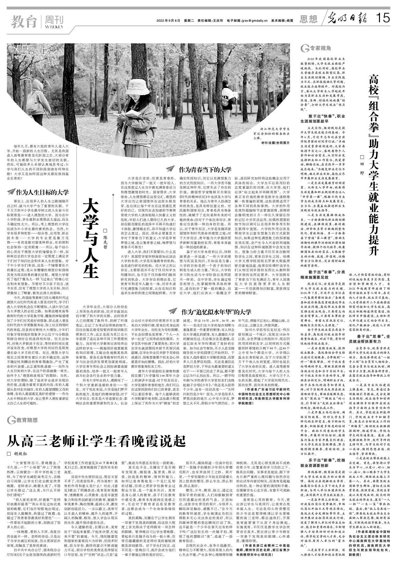 2022年我国高校毕业生数量剧增,大学生就业面临严峻挑战。与此同时,高校毕业生普遍存在就业期望过高、职业生涯规划模糊、专业实践能力不足、求职技能缺乏等问题,就业能力亟待提升。对高校而言,要从大学新生入学起就开始为其职业生涯和发展考虑,快速、准确、创造性地施展“组合拳”,打好大学生就业“保卫战”。