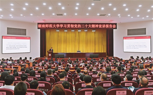 11月9日上午9时,记者来到湖南师范大学国际学术报告厅,一场学习贯彻党的二十大精神宣讲会正在这里举行,宣讲人是该校党委书记蒋洪新。