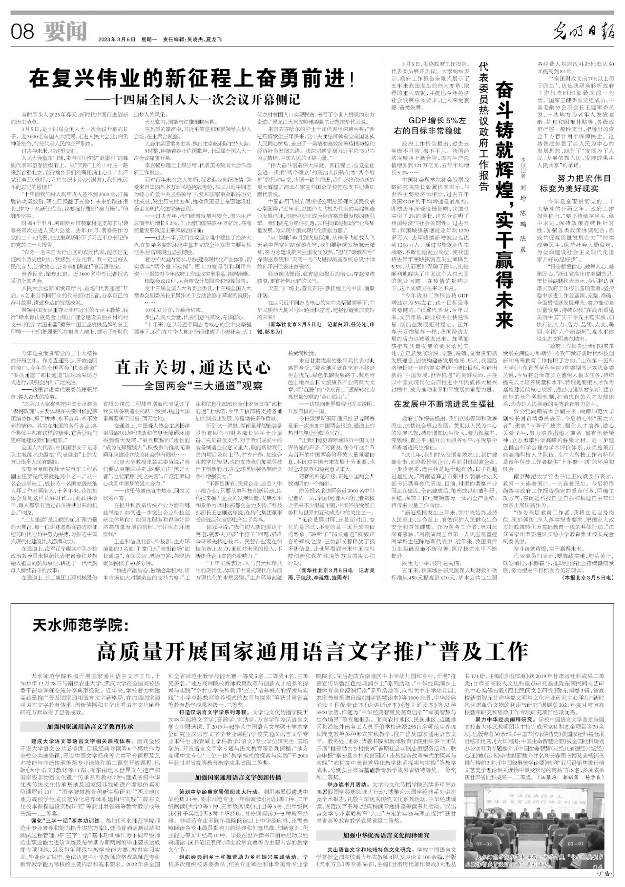 南京师范大学党委书记王成斌委员表示,教育一头连着国计,一头连着民生。今后将围绕落实政府工作报告确定的重点任务,明确主攻方向,在促进科技自立自强和构建自主知识体系上展现新作为。