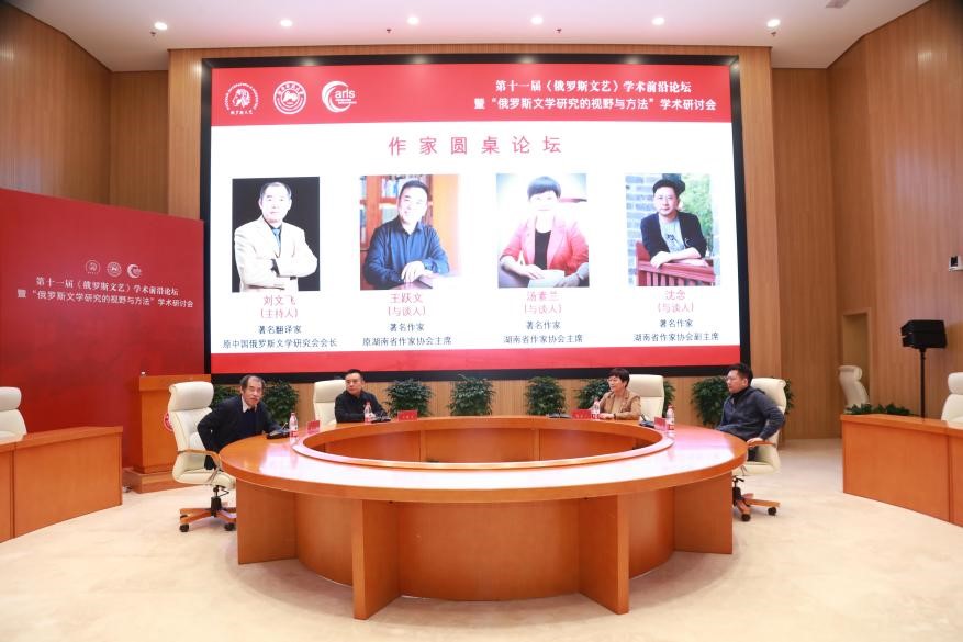 需要着重指出的是,本次研讨会专门设置了“作家圆桌论坛”,论坛由著名翻译家、原中国俄罗斯文学研究会会长刘文飞主持,三位湘籍著名作家——原湖南省作家协会主席王跃文、湖南省作家协会主席汤素兰、湖南省作家协会副主席沈念在论坛上讲述了他们眼中的俄罗斯文学,同观众分享了俄罗斯文学对其创作的影响。