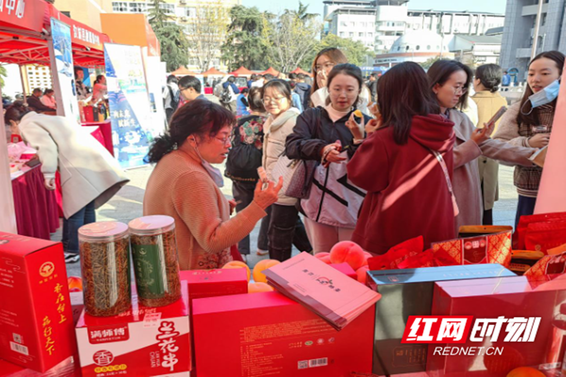 在湖师大五舍广场,一场别开生面的“湖湘地方特色文化进校园”活动同步举行。此次活动得到了大祥区委宣传部、区农业农村局、以及区融媒体中心的共同策划与支持。他们联手组织了大祥区特色农产品企业的参展,旨在推广大祥区的农业产业与独特文化。活动现场,映霜红桃、香葱油、神骏黑木耳、宝庆米粉、宝庆朝天椒等大祥特产一一亮相,吸引了与会人员、湖师大师生以及市民们的目光。这些具有地方特色的农产品为大家提供了一个深入了解大祥区农业和文化的窗口,也展现了大祥区农业的丰硕成果和独特魅力。