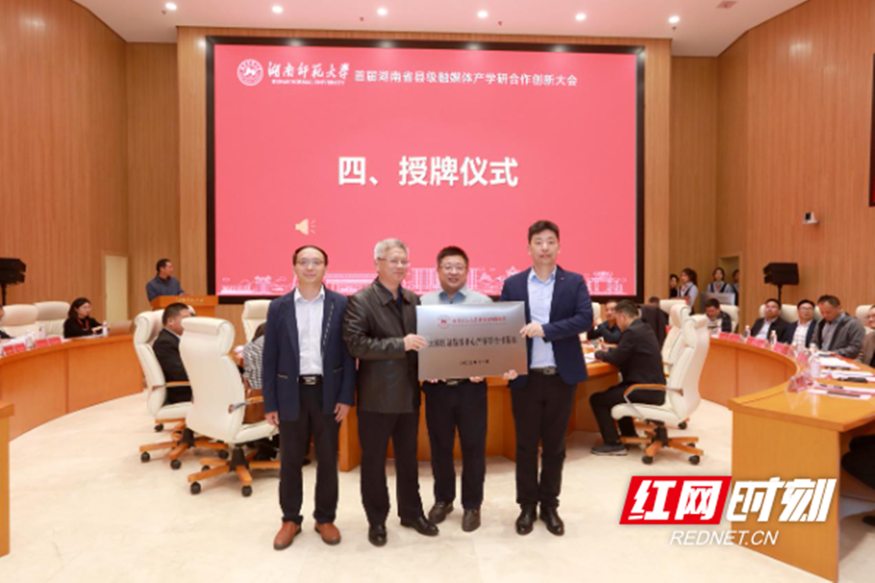 在随后进行的授牌仪式上,湖南师范大学校领导为大祥区融媒体中心颁发了“湖南师范大学新闻与传播学院大祥区融媒体中心产学研合作基地”牌匾。这标志着大祥区融媒体中心正式成为湖南师范大学的合作伙伴,双方将在人才培养、科研合作等方面展开深度合作。