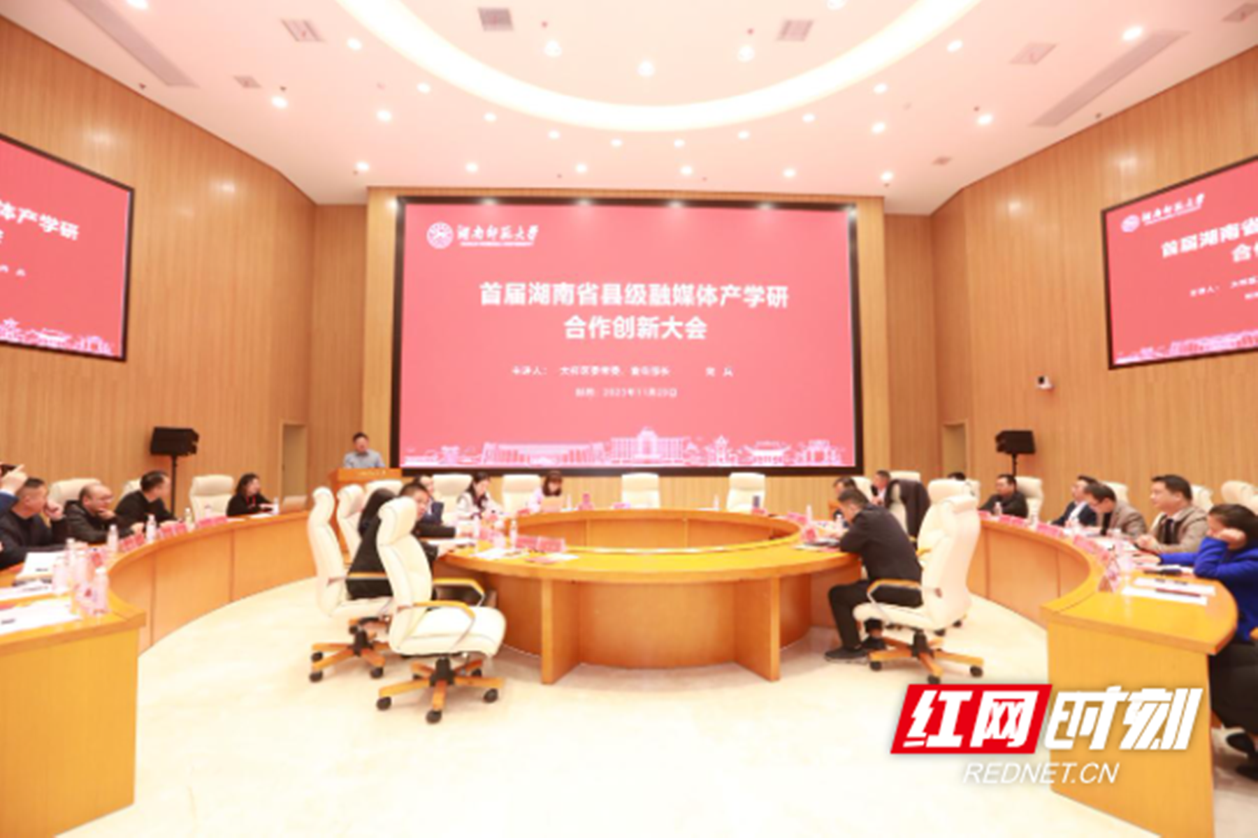红网时刻新闻11月30日讯(通讯员 张海波)11月29日,湖南师范大学在长沙举办首届湖南省县级融媒体产学研合作创新大会暨湖湘地方特色文化进校园活动,会上,湖南师范大学新闻传播学院与大祥区融媒体中心签署了产学研合作基地共建协议并授牌,标志着湖南师范大学与大祥区正式开启深度合作,共同推动媒体融合发展。大祥区委常委、宣传部长向兵出席并致辞,区委宣传部、区融媒体中心、区农业农村局以及大祥区特色农产品企业代表也一同参加了此次盛会。