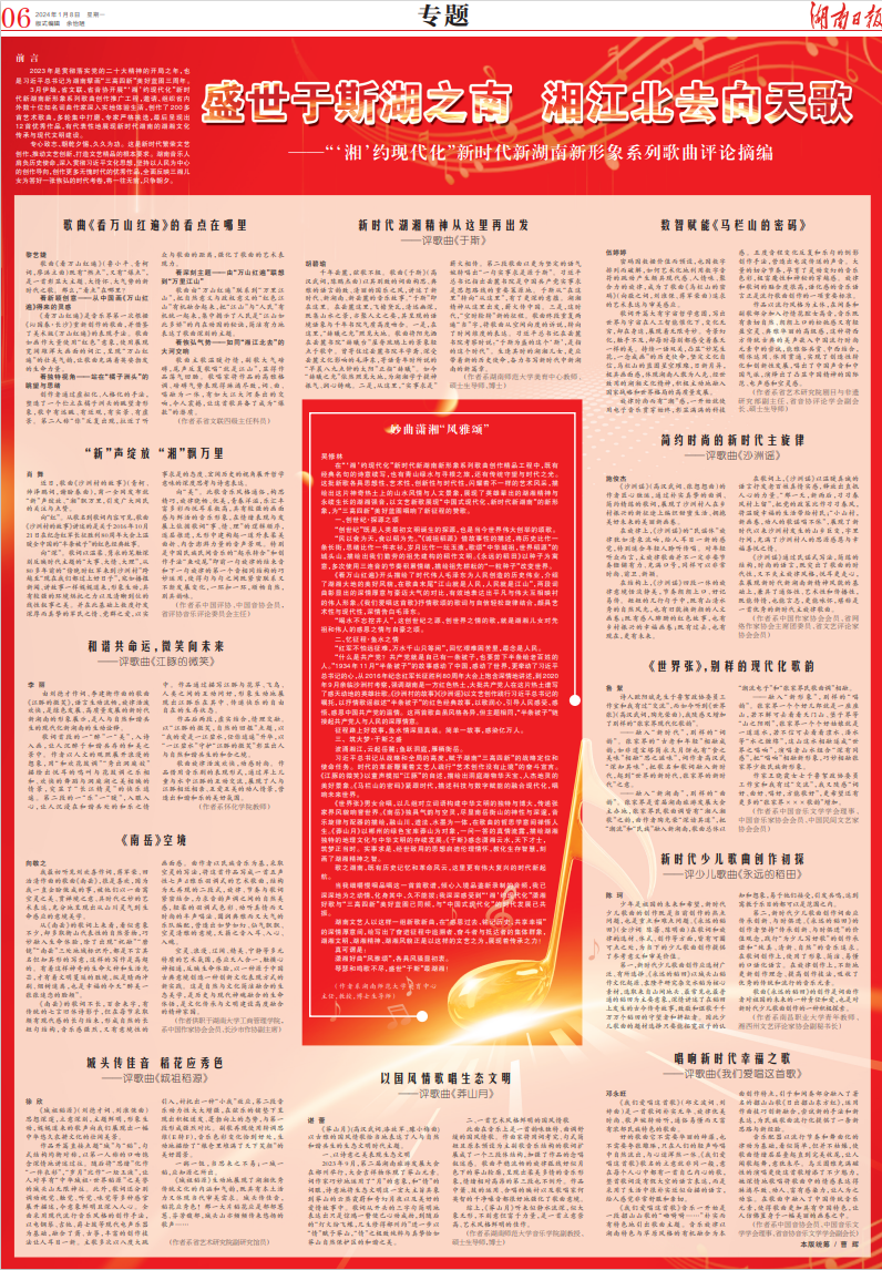 在“‘湘’约现代化”新时代新湖南新形象系列歌曲创作精品工程中,既有经典名句的诗意续写,也有青山绿水与寻根之旅,还有传统守望与时代之光。这批新歌各具思想性、艺术性、创新性与时代性,闪耀着不一样的艺术风采,描绘出这片神奇热土上的山水风情与人文景象,展现了英雄辈出的湖湘精神与永续生长的湖湘强音,以文艺新歌展现“中国式现代化、新时代新湖南”的新形象,为“三高四新”美好蓝图唱响了新征程的赞歌。