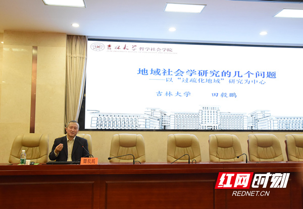 红网时刻新闻10月28日讯(通讯员 贺颀嘉 彭惠敏)10月26日下午,应湖南师范大学公共管理学院社会学系邀请,吉林大学哲学社会学院教授、博士生导师田毅鹏在湖南师范大学作题为“地域社会学研究的几个问题——以‘过疏化地域’研究为中心”的学术讲座。讲座由湖南师大社会学系主任罗忠勇教授主持。
