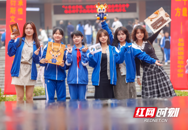 师大附中梅溪湖中学,在读学生与已毕业的学生手持学校文创产品展示。