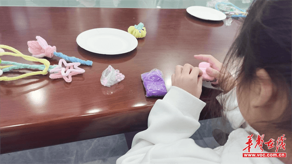 通过“考核”的孩子们满怀期待地投身于手工制作环节,利用扭扭棒、粘土、画笔与纸盘等材料,尽情挥洒创意。在志愿者的悉心陪伴下,他们描绘出蓝天白云、青草大地的美丽画卷,编织出花环、魔法棒的奇妙造型,塑造出蛋糕、卡通人物的生动形象。孩子们通过手工作品,表达了内心的纯真与美好。