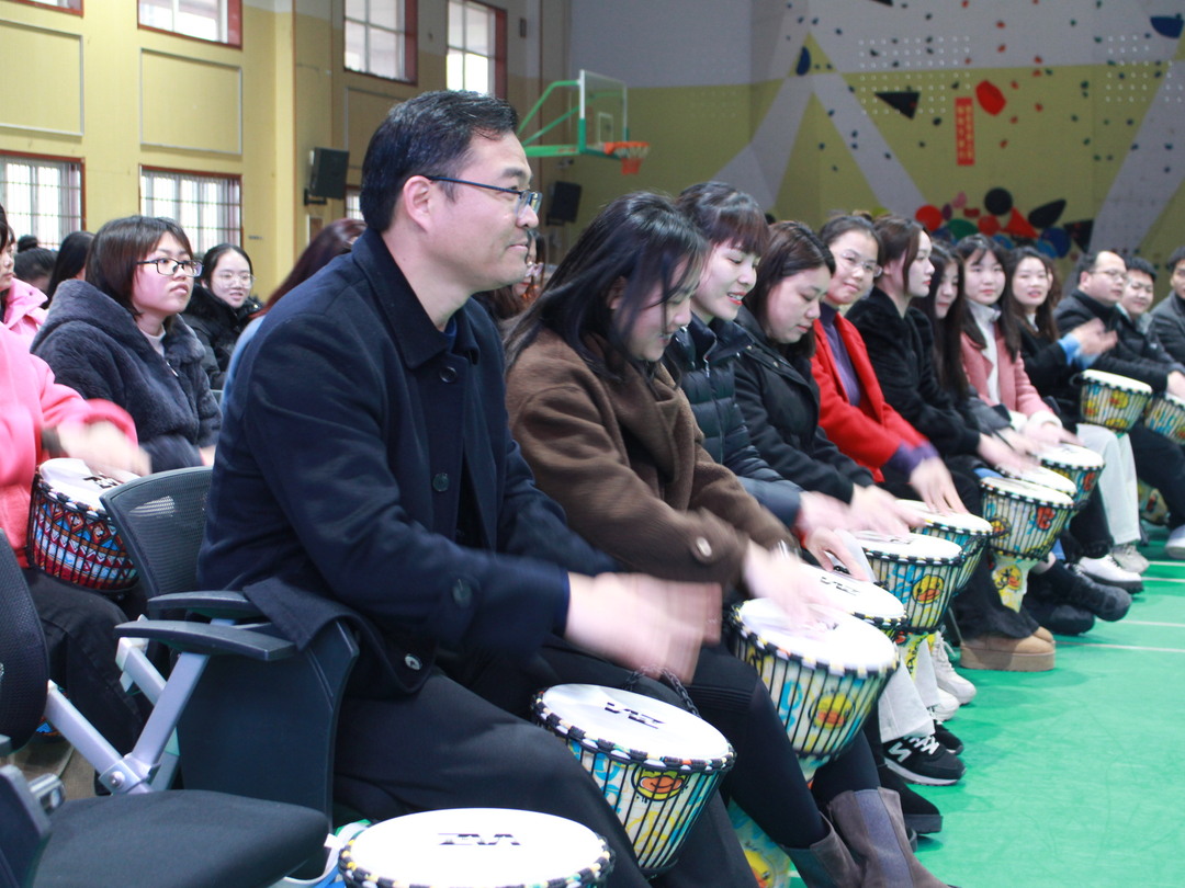 在随后的“音乐疗愈团辅”环节,学校邀请的专业音乐治疗师通过带领班主任们演奏手碟和非洲鼓,为大家提供一个释放压力、舒缓心情的平台。