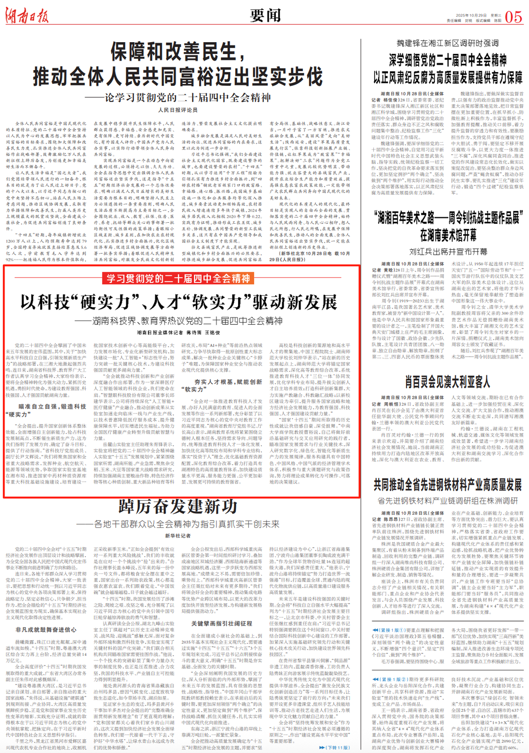 党的二十届四中全会擘画了中国未来五年发展的宏伟蓝图,其中,关于“加快高水平科技自立自强,引领发展新质生产力”的战略部署,在三湘大地激起强烈共鸣。连日来,湖南省科技界、教育界广大工作者认真学习全会精神,大家纷纷表示,要将全会精神转化为强大动力,紧抓历史机遇,勇担时代使命,为建设教育强国、科技强国、人才强国贡献湖南力量。